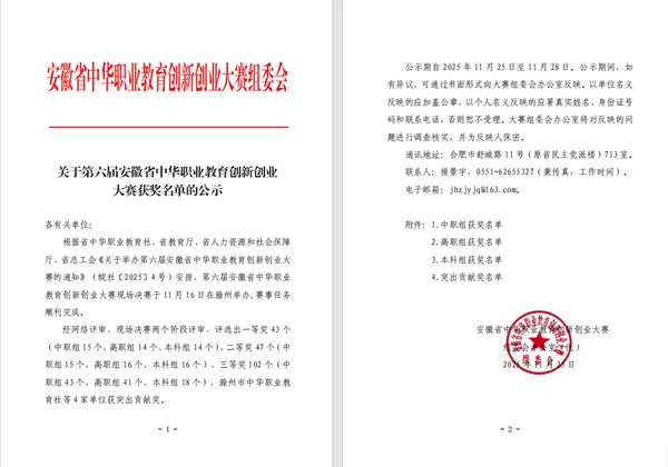 11月25日,第六届安徽省中华职业教育创新创业大赛高职组获奖名单公布,我院师生表现优异,7名师生获奖。