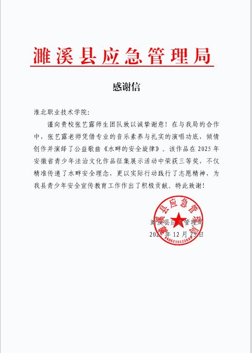 淮北市濉溪县应急管理局给张艺露师生团队发来感谢信